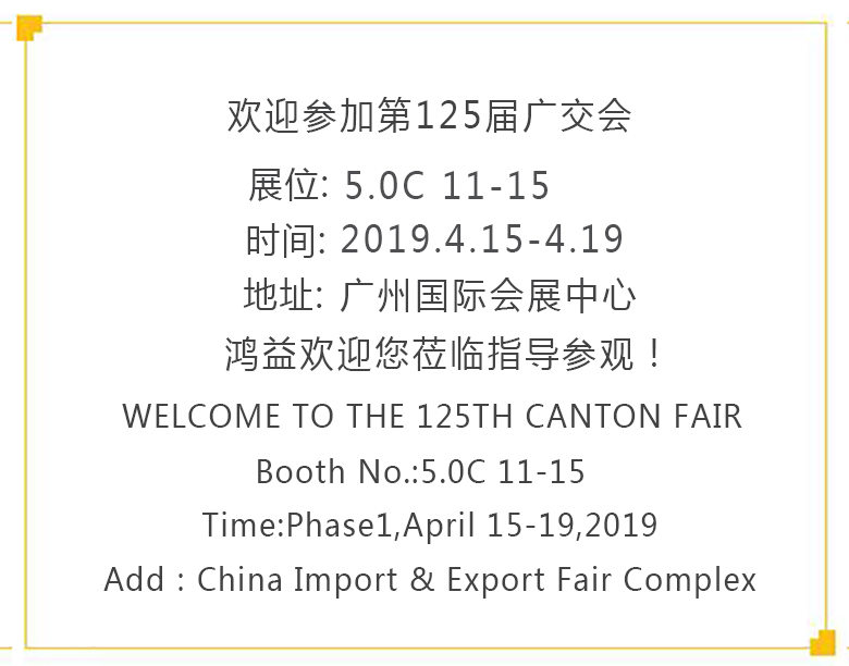 創(chuàng)新科技,行業(yè)領(lǐng)先!鴻益機(jī)械連續(xù)20多屆參與廣交會,2019春季中國進(jìn)出口產(chǎn)品交易會,再次如約而至。鴻益機(jī)械帶您領(lǐng)略科技創(chuàng)新技術(shù),歡迎全球新老顧客蒞臨參觀指導(dǎo),鴻益機(jī)械期待您的到來!