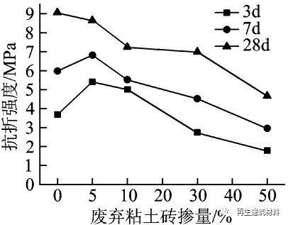 (1) 水泥熟料摻廢棄混凝土和廢棄粘土磚作混合材,降低了水泥熟料的強度。究其原因,水泥強度主要來源于水泥熟料的水化產(chǎn)物 C-S-H 強度, 因廢棄混凝土和廢棄粘土磚的水化活性不及水泥熟料,樣品水泥總體的水化活性有所降低,降低了水泥強度。