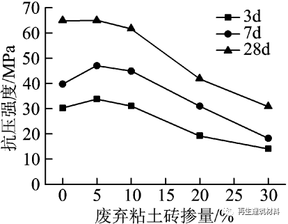 (3) 摻量大于 10% 后,廢棄混凝土水泥膠砂強度較廢棄粘土磚水泥的高。廢棄混凝土中含有部分未水化的水泥顆粒, 具有一定的水化活性。同時廢棄混凝土中碳酸鈣含量高, 在水化過程可與熟料的C3A 和 C4AF 反應生成水化碳鋁酸鈣 , 可以與其他水化產(chǎn)物相互搭接,使體系結(jié)構更加密實,增強體系的強度。